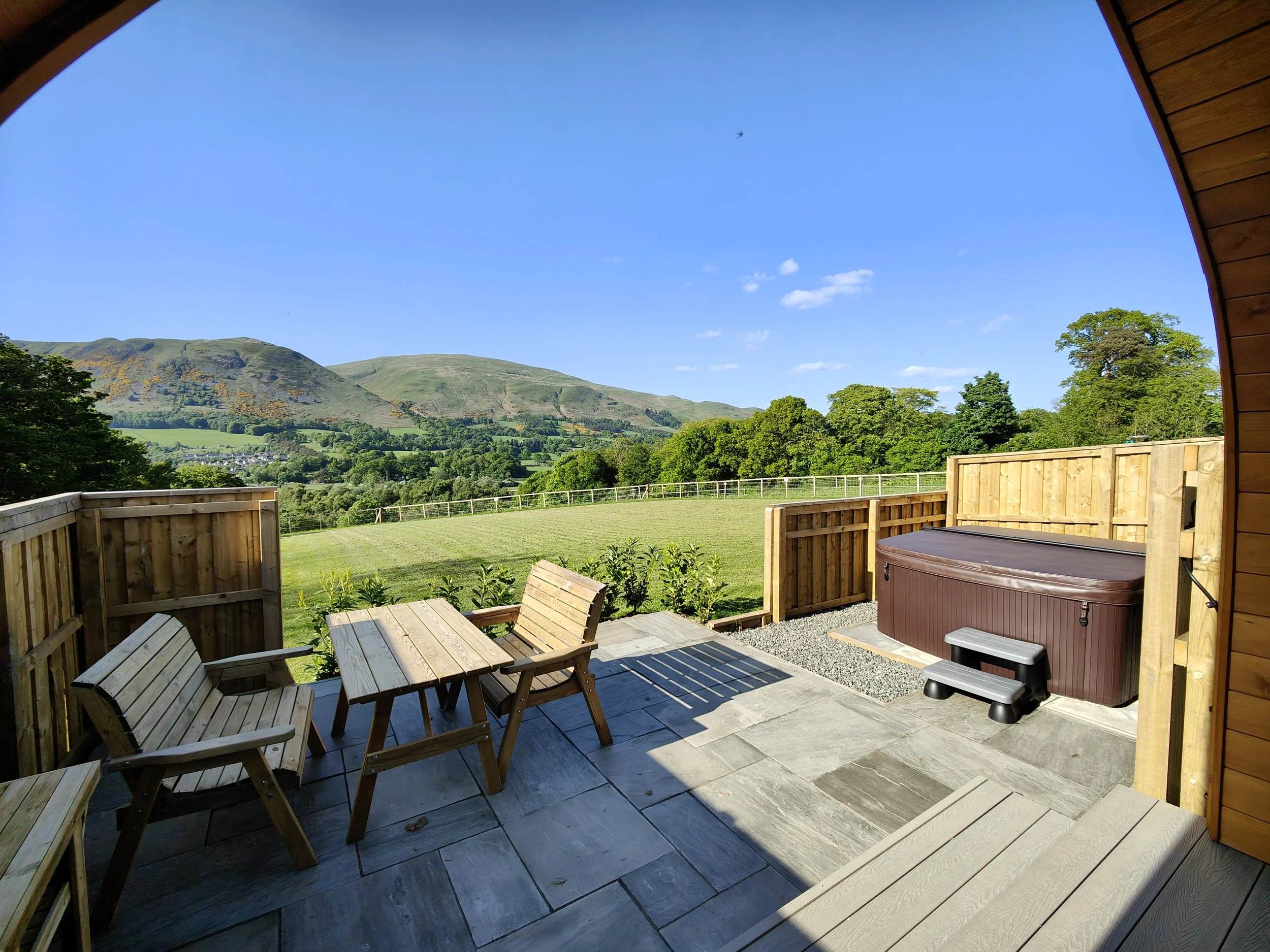 Each pod has underfloor heating, a private hot tub and paved seating area with table & chairs and a BBQ table
